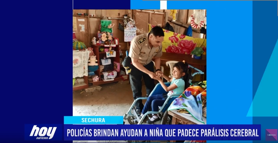 Agentes de la Comisaría de Sechura brindaron ayuda humanitaria a una menor de 9 años que padece de una parálisis cerebral y además se ha visto afectada por la poliomielitis. Los efectivos policiales llegaron hasta su vivienda ubicada en Rinconada Llícuar para entregarle una cama y productos de primera necesidad.