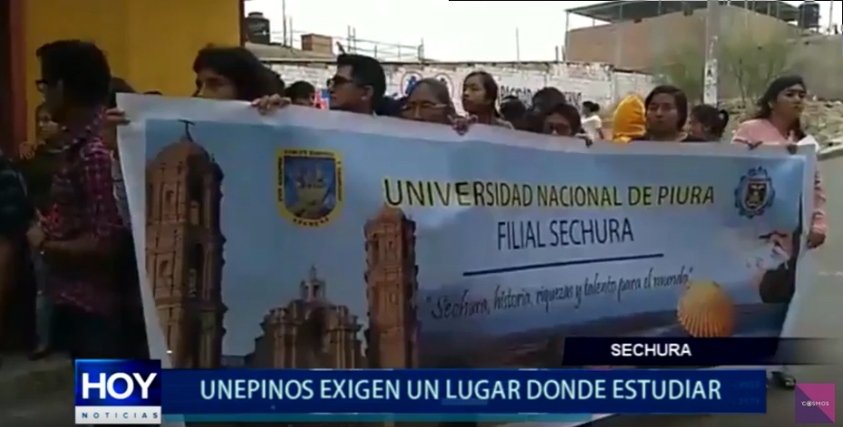 Estudiantes de la filial UNP en Sechura, recorrieron las principales calles de la ciudad para exigir un mayor compromiso de las autoridades provinciales, debido a que no tienen un local propio para escuchar el normal dictado de sus clases universitarias.