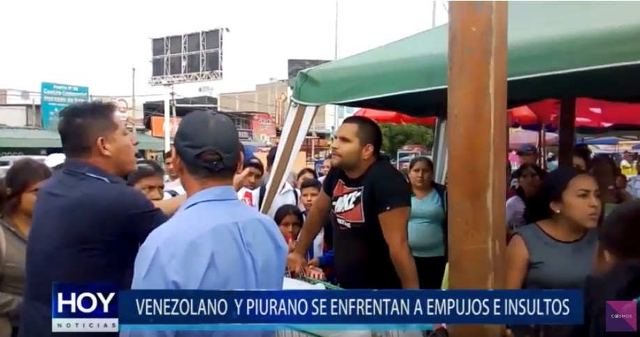 Venezolano y piurano se enfrentan a empujos e insultos en mercado de Piura por un puesto de ventas. policía nacional tuvo que llegar al lugar para poder calmar a los enfurecidos hombres.