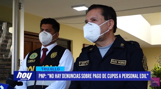 La autoridad policial en la región La Libertad, informó a la prensa que no se han registrado denuncias de comerciantes ambulantes. Esto con respecto a un presunto pago de cupos a malos trabajadores de la municipalidad de Trujillo para que los dejen ocupar la vía pública.