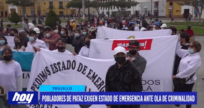 Moradores de Pataz protestaron en la plaza mayor de Trujillo pidiendo Estado de Emergencia en la provincia ya que la delincuencia y la minería ilegal se ha incrementado, por lo que pide mayor intervención de autoridades.