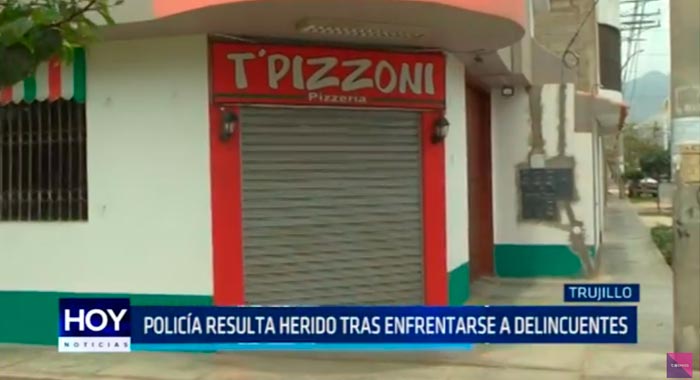 Un efectivo policial resultó herido tras enfrentarse a dos sujetos armados que ingresaron a robar a una pizzería en la urbanización San Isidro.