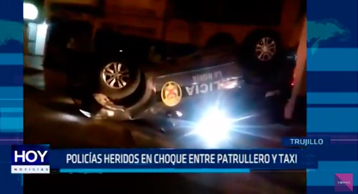 Dos policías y un taxista heridos dejó la colisión de un patrullero y un auto en Trujillo. Al parecer, imprudencia y excesiva velocidad causo el accidente. Unidad policial dio vueltas de campana.