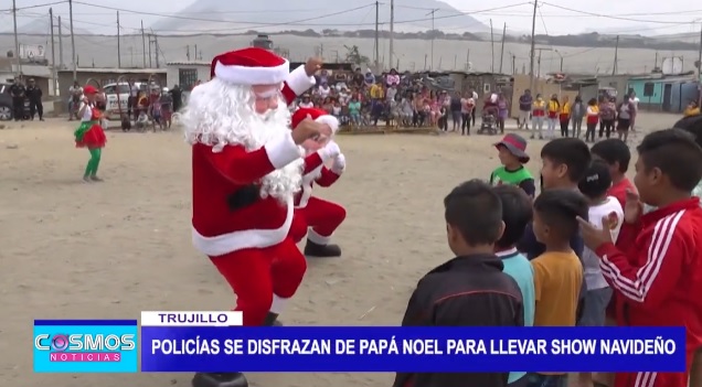 En el distrito de Salaverry en la ciudad de Trujillo, policías se disfrazan de Papá Noel y Mamá Noela para llevar show a niños de bajos recursos del asentamiento humano las brisas de Salaverry.