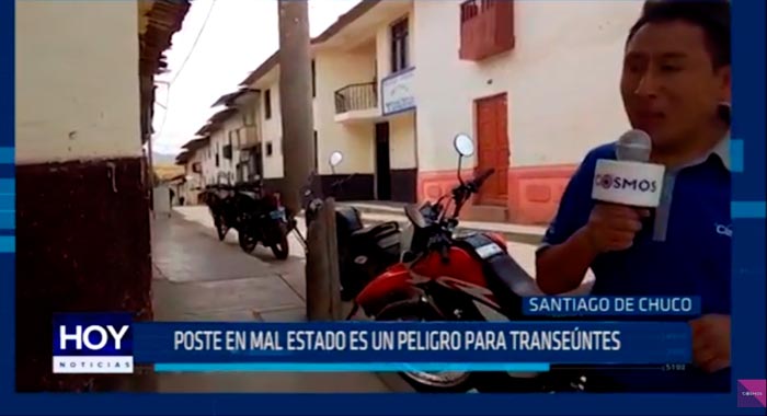 En la provincia de Santiago de Chuco un poste en mal estado genera un riesgo eminente a los transeúntes de la localidad y las autoridades del lugar no toman medidas preventivas. Los pobladores del barrio San José indicaron que este problema tiene tiempo y que nadie hace nada para dar solución.
