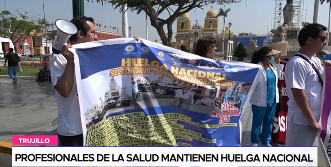 Gremios de médicos, enfermeras, obstetras, cirujanos dentistas entre otros profesionales que laboran en los distintos hospitales del Ministerio de Salud mantienen la huelga nacional, ellos llegaron a la plaza mayor de Trujillo para exigir al gobierno de turno la nivelación por tiempo de servicio.