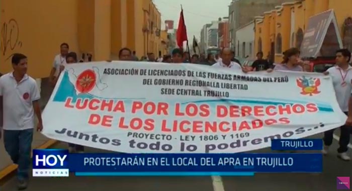 El Sindicato de Licenciados del Ejército Peruano de La Libertad acusó al Partido Aprista de intentar bloquear la implementación de la ley 1169 que les otorga beneficios por haber participado en el proceso de pacificación del país. Por ello, se convocó a un plantón en el frontis del partido de la estrella.