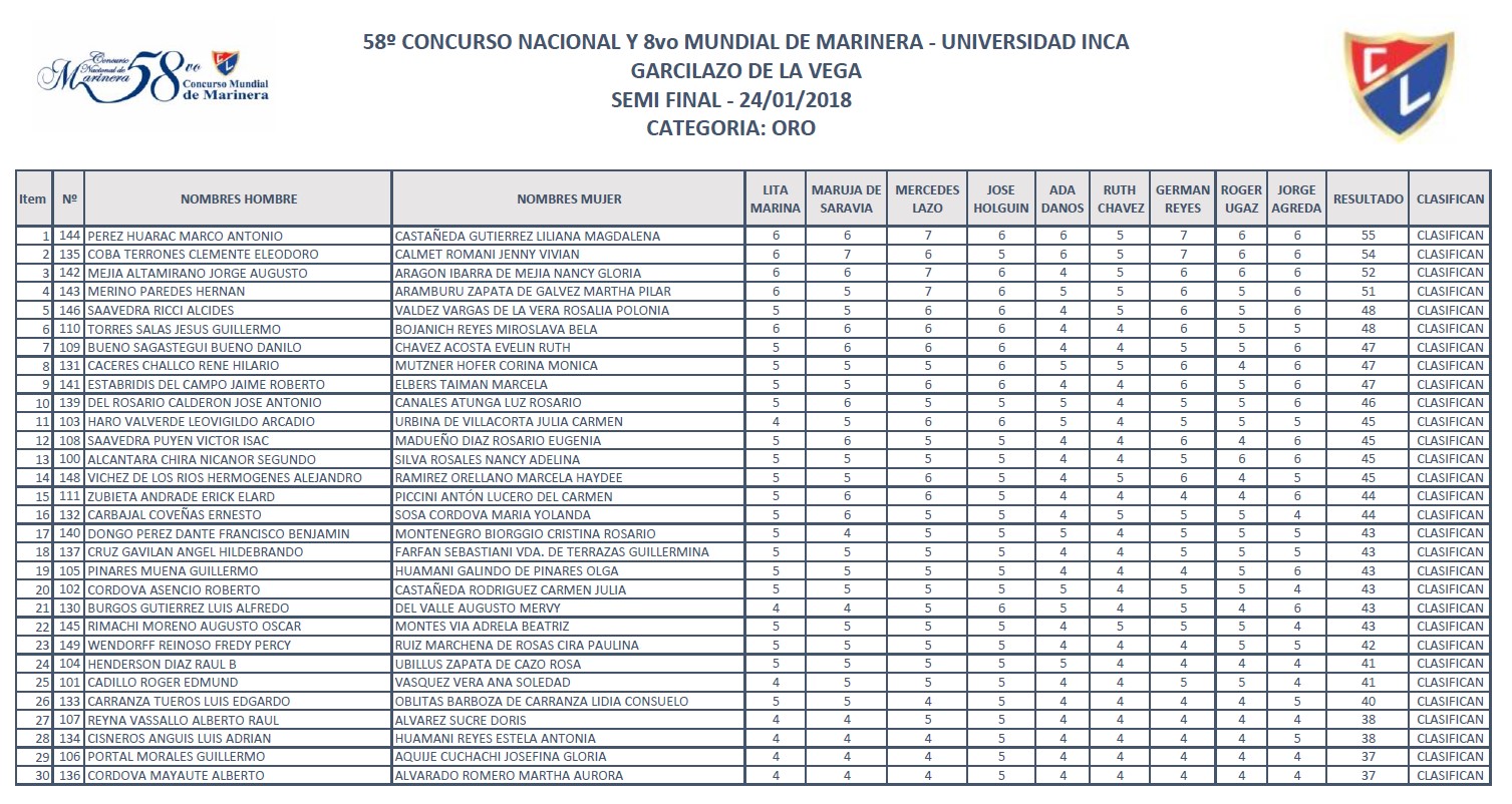 En el marco del 58° Concurso Nacional de Marinera, el día de ayer 25 de enero se dio la competencia de parejas de las categorías de la Unidad. Además compitieron por la semifinal las categorías Noveles, Infantes, Junior, Adultos y Máster, en el coliseo cerrado Gran Chimú en Trujillo.