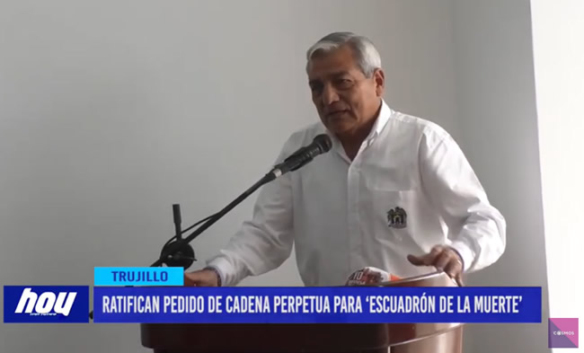 La fiscal superior Ada Margoth Peñaranda Bolovich de la 1° Fiscalía Superior Penal de La Libertad ratificó en audiencia el requerimiento de cadena perpetua contra el exalcalde de Trujillo, coronel en retiro, Elidio Espinoza Quispe, y los policías José Alberto Monge Balta, Wilson de la Cruz Castañeda, Marco Luis Quispe Gonzales, Jimy Alberto Cortegana Cueva, Jairo Trinidad Mariño Reyes, Néstor Agustín Castro Ríos, Hugo Noé Villar Chalán, Abel Salazar Ruíz y Manuel Wilmer Villanueva Fermín.
