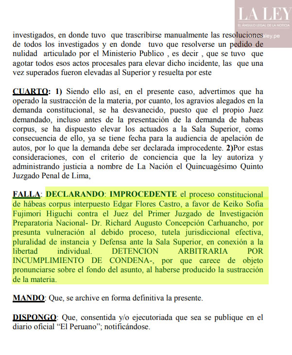 Este procedimiento jurídico buscaba cuestionar la medida de prisión preventiva en contra de la lideresa de Fuerza Popular impuesta por el juez Concepción Carhuancho en la investigación preparatoria que se le sigue a Fujimori Higushi por el presunto delito de lavado de activos.