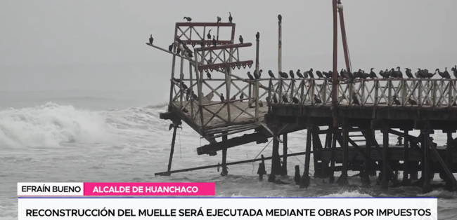 El alcalde del distrito de Huanchaco, Efraín Bueno, se pronunció sobre el colapso del emblemático muelle de la zona, señalando que su restructuración se ejecutará mediante la modalidad de obras por impuestos por un monto de 40 millones de soles, en coordinación con el Gobierno Regional de La Libertad.