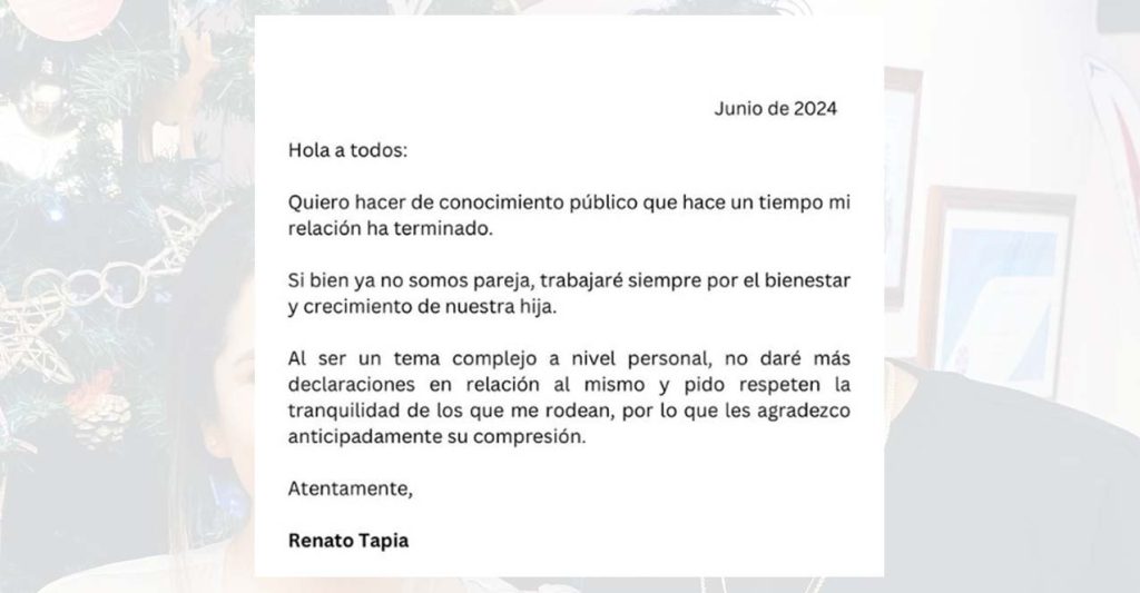 «Quiero hacer de conocimiento público que hace un tiempo mi relación ha terminado», escribió Tapia en una historia de Instagram. Continuó diciendo: «Al ser un tema complejo a nivel personal, no daré más declaraciones al respecto y pido que respeten la tranquilidad de los que me rodean. Les agradezco anticipadamente su comprensión», se lee en el comunicado publicado.