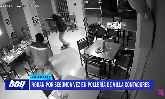 Tres delincuentes con armas de fuego y cubiertos sus rostros con poleras, asaltaron una pollería chifa despojando de sus pertenecías a quince comensales. Es la segunda vez, que sujetos inescrupulosos ingresan a robar en este local de la urbanización Villa de Contadores.