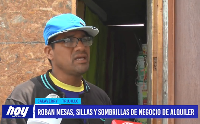 Jorge Velásquez Padilla, tiene desde hace cuatro años un negocio de alquiler de mesas, sillas y sombrillas para época de verano en el balneario de Salaverry. Todos estos enseres los adquirió recientemente a fin de renovarlos para ofrecer a los veraneantes, sin embargo grande es su indignación al llegar a este almacén y percatarse que sujetos de mal vivir ingresaron para llevarse las cosas.