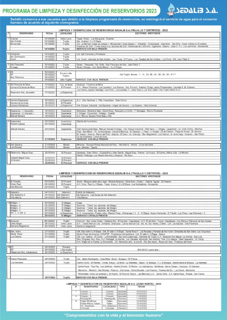 El beneficioso programa de limpieza y desinfección de 54 reservorios y 05 cámaras de bombeo de Trujillo, Chepén y Ascope, correspondiente al segundo semestre del 2023, efectuará Sedalib del 10 al 29 de este mes.