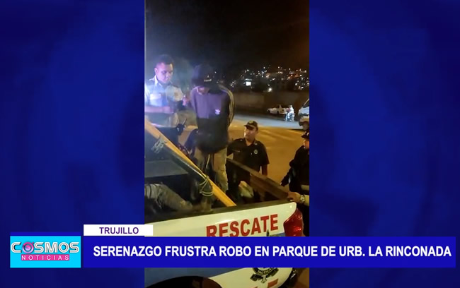 Agentes de serenazgo frustraron un robo en la urbanización La Rinconada en la ciudad de Trujillo. La noche del martes personal de seguridad ciudadana frustró un asalto en el parque La Amistad de la urbanización La Rinconada, donde tres sujetos, dos de nacionalidad extranjera venezolana y un peruano, identificados como Elver Escalona de 22, Hermes Ford José Acevedo de 18 y Cales Pérez de 31 intentaron asaltar con una réplica de arma de fuego y un arma blanca a dos jóvenes.