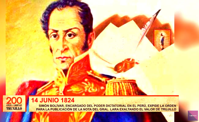 Un día como hoy en 1824, Simón Bolívar encargado del poder dictatorial en el Perú, expide la orden para la publicación de la nota del general Lara, exaltando el valor de Trujillo.