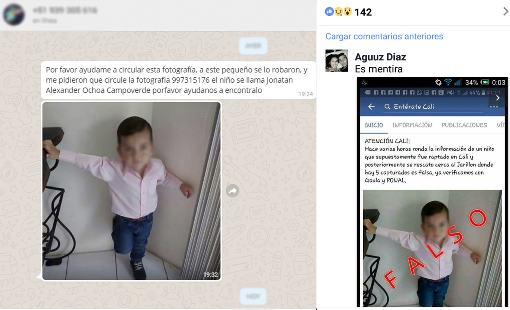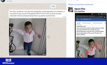 Últimamente se está compartiendo por Whatsapp con la fotografía de un niño supuestamente secuestrado, la imagen cuenta con datos de como nombre del menor y un número falso. Esta información es considerada como un Spam
