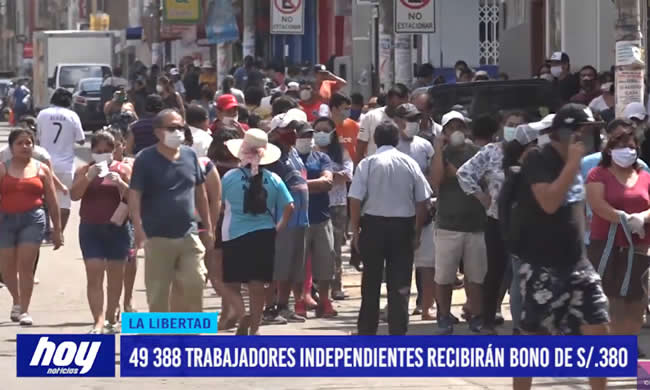 Cerca de 780 mil hogares vulnerables con trabajadores independientes, han sido identificados en el padrón de hogares beneficiarios para el subsidio de los 380 soles, otorgado por el gobierno. En la región La libertad, 49 388 recibirán este subsidio y el distrito de Trujillo tiene el mayor número de estos con más de 34 mil trabajadores.