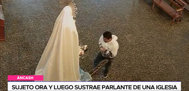 Este insólito hecho ocurrió en la parroquia San Pedro de Carhuaz en la región Áncash, en este video registrado por la cámara de seguridad se observa como este sujeto ingresa a la iglesia y empieza a buscar una manera para sustraer el equipo. Segundos después, un efectivo policial hace su ingreso al templo, ante su presencia, el malhechor, solo atinó a persignarse para pasar desapercibido. Tras pasar este susto, camina y se moja la cabeza con un poco de agua bendita. Minutos más tarde, se acerca a la imagen de la virgen María, para arrodillarse y orar como un fiel devoto.
