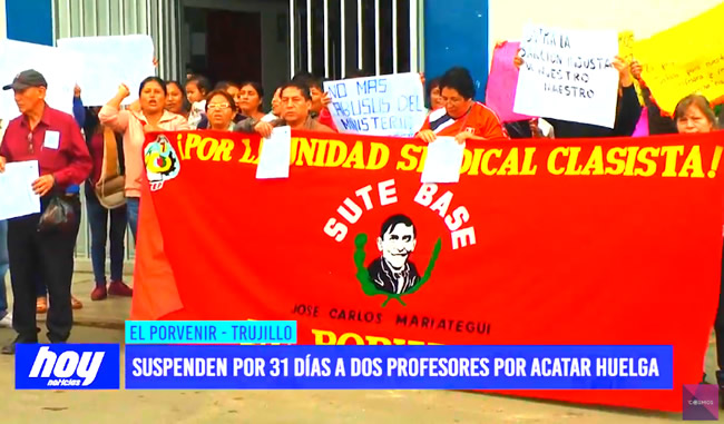 Dos docentes del nivel primario del colegio José Carlos Mariátegui de El Porvenir fueron suspendidos por 31 días sin goce de haber por haber acatado una huelga el año pasado.