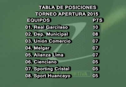 Inicio Noticias Deportes Tabla de posiciones Torneo Apertura 2015 NoticiasDeportes Tabla de posiciones Torneo Apertura 2015 Por Tv Cosmos - 14/05/2015 367 0 FacebookTwitterPinterestWhatsApp TE PUEDE INTERESAR Si te interesa todo sobre el mundo deportivo, puedes seguir nuestras últimas publicaciones por Facebook, también puedes suscribirte aquí a nuestro canal de y seguir nuestras noticias deportivas. Zona Deportiva Artículos relacionadosMás del autor TVPerú estrenará “Tu decisión 2026”, programa electoral rumbo a las elecciones generales Hospital Militar Central: pacientes con discapacidad siguen sin ascensor mientras responsables continúan en funciones 2 mil familias agricultoras se beneficiarán con laguna artificial en Santiago de Chuco POPULAR CATEGORIESNoticias66232Actualidad51007Trujillo42650Nacionales9348Deportes7303Espectáculos4545 NUEVO CONSEJO DIRECTIVO ASUME LA ASOCIACIÓN NUMISMÁTICA Y FILATÉLICA DE TRUJILLO TV COSMOS - 05/03/2026 0 Congreso premiará este martes a ganadores del Concurso Nacional de Fotografía “Mujeres que Inspiran” TV COSMOS - 03/03/2026 0 Alejandro Sanz presenta el video de ‘Rimowa’ en colaboración con Elena Rose TV COSMOS - 23/02/2026 0 Jaze logra su primer sold out en México y consolida su gira internacional TV COSMOS - 23/02/2026 0 Han pasado más de 20 años y la anemia sigue afectando a más del... TV COSMOS - 19/02/2026 0 - Advertisement -