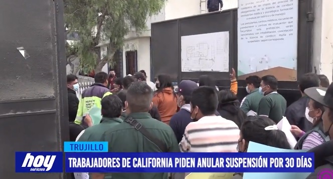 Trabajadores de la Empresa California llegaron hasta la Gerencia de Transportes, Tránsito y Seguridad Vial de la Municipalidad de Trujillo para protestar y pedir la anulación de la suspensión por 30 días que se les impuso luego del accidente producido por 2 de sus unidades dejando como saldo una persona fallecida, según indicó el gerente de dicha empresa, más de 200 trabajadores son afectados económicamente por la paralización del servicio.