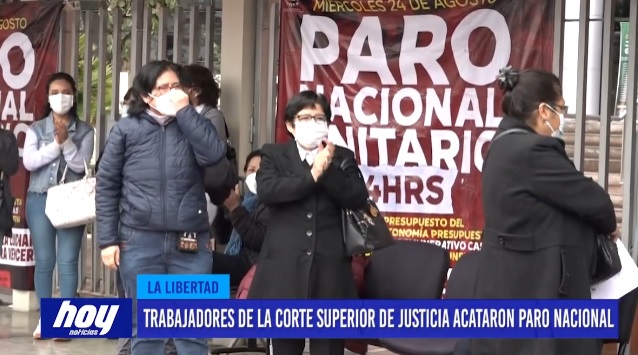 Integrantes del sindicato de trabajadores de la Corte Superior de Justicia de La Libertad acataron un paro nacional de 24 horas. Los trabajadores se ubicaron en los exteriores de la corte ubicada en la urbanización Natasha. Asimismo, de la sede ubicada en el centro histórico también se sumaron a esta lucha. Ellos exigen el cumplimiento de la escala remunerativa del tercer tramo y nivel de pagos de sus compañeros de la modalidad CAS. Ellos aseguran que es una lucha reivindicativa de sus derechos.