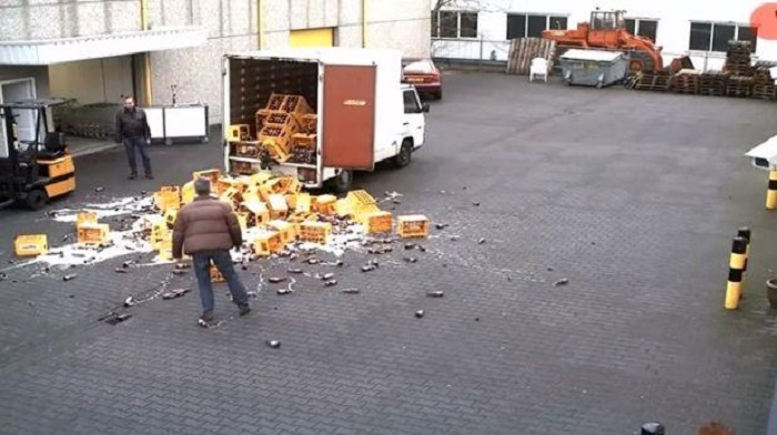 Las botellas se rompieron y los hombres lamentaron su grave error al descargar las cajas del vehículo; los sujetos se olvidaron de colocar una rampa que sirva de puente entre el camión y el suelo.
