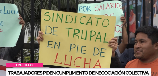 Los trabajadores afiliados al sindicato de la empresa Trupal realizaron un plantón en el frontis de la Gerencia Regional de Trabajo y Promoción del Empleo en Trujillo para alzar su voz y exigir a los representantes de la compañía respeten los acuerdos de negociación colectiva.