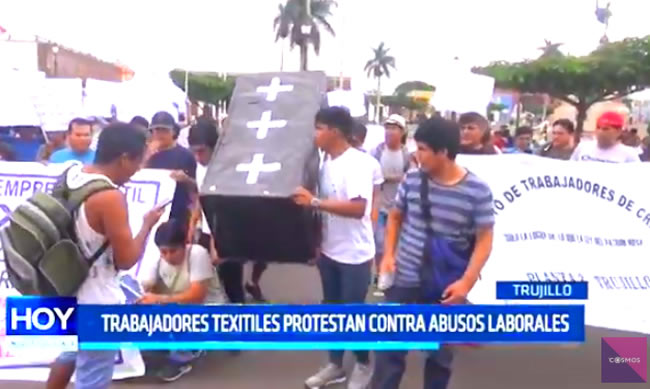 Los trabajadores del sector textil de Trujillo paralizaron sus labores y protestaron en el Centro Histórico contra las políticas laborales del Gobierno Central, que, según ellos, afectan sus derechos.