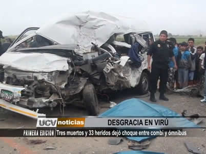 Tres muertos y 33 heridos de consideración dejó la violenta colisión de una combi con un ómnibus que transportaba trabajadores de Camposol en la provincia de Virú. El conductor de la última unidad invadió el carril contrario y provocó el accidente.