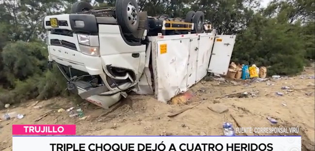 Un aparatoso accidente de tránsito se registró la mañana del jueves en plena Panamericana Norte, a la altura de la empresa Camposol, donde un auto, un bus y un camión protagonizaron un triple choque que dejó como saldo a cuatro personas gravemente heridas. El impacto fue tan violento que generó gran alarma entre los vecinos de la zona.