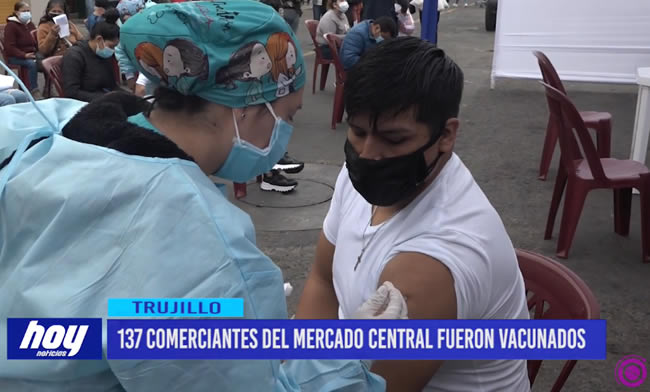 En los exteriores del mercado Central, 137 comerciantes del mencionado centro de abastos recibieron la vacuna anticovid, esto tras la coordinación de la Gerencia Regional de Salud, la MPT y la asociación de propietarios del mercado Central.