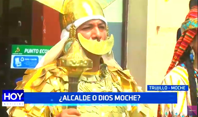 Soportando una pesada indumentaria y una joya de metal sostenida a su nariz, bajo una sofocante temperatura de 28 grados, el alcalde de Moche, Arturo Fernández, fiel a su estilo, no dudo en representar por segunda vez al Dios Moche, en una ceremonia especial, desarrollada en la Plaza principal de Moche.