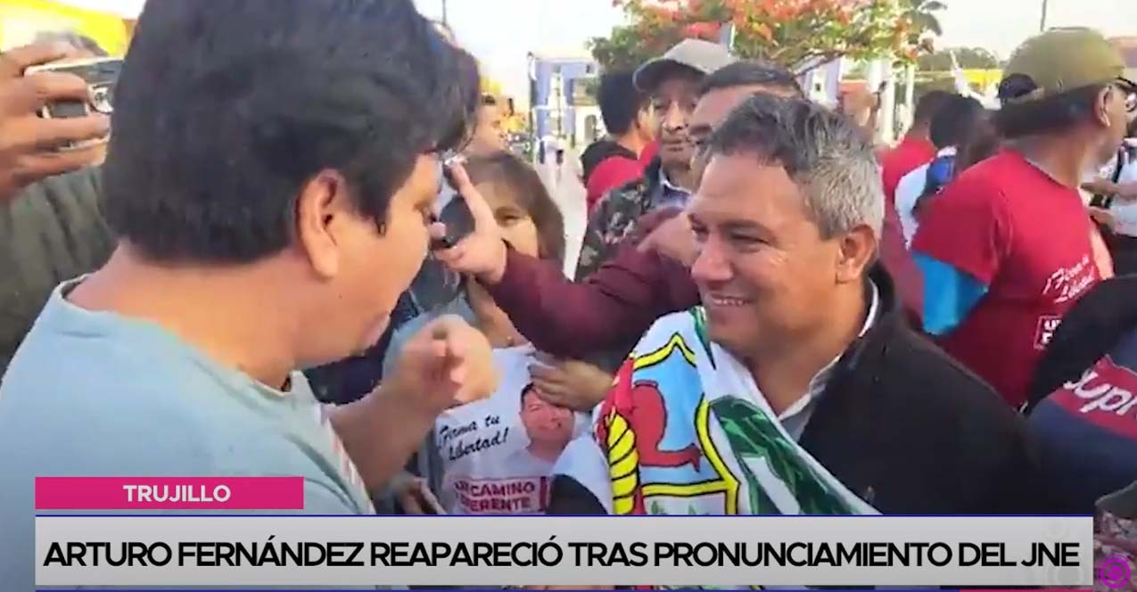 Arturo Fernández reapareció junto a sus simpatizantes en el frontis de la municipalidad de Trujillo tras pronunciamiento del JNE, seguro de su retorno a la alcaldía. Mientras que Mario Reyna prefiere esperar la resolución completa del órgano electoral.