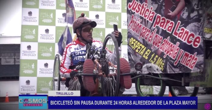 Turista extranjero buscó romper récord de manejar en bicicleta por 24 horas alrededor de la Plaza Mayor de Trujillo.