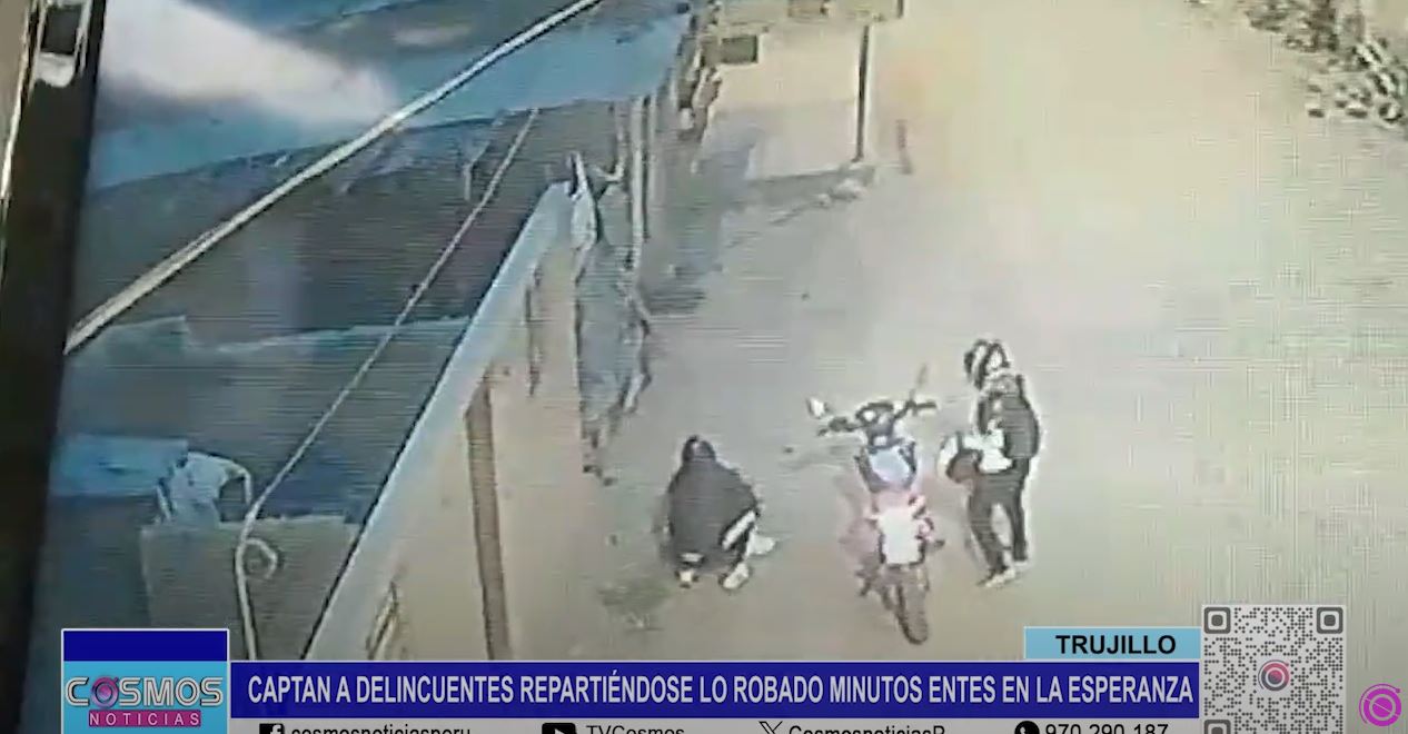 En solo dos minutos, un par de delincuentes se repartió lo robado a una joven en el distrito de La Esperanza. Cámaras instaladas por vecinos del Asentamiento Humano Nuevo Jerusalén, 4to sector, captaron a los facinerosos seleccionando artículos del interior de la cartera.