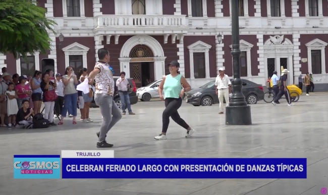 Decenas de turistas locales y extranjeros disfrutaron de las danzas típicas peruanas en la plaza mayor de Trujillo.
