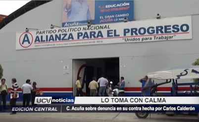 El gobernador regional, César Acuña, aseguró que la denuncia hecha por el aprista Carlos Calderón, sobre el uso de una frase en la gestión regional y su partido Alianza Para el Progreso, no configura delito. Del mismo modo, insistió que aún no decide si postulará a la presidencia de la República.