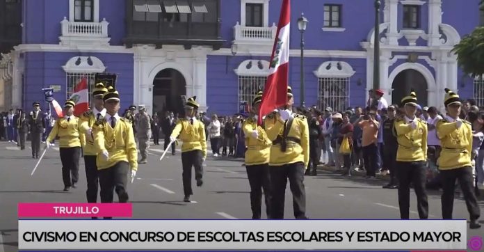 Con paso marcial y amor por la patria, escolares de más de 70 instituciones educativas de la región La Libertad, participaron en el Concurso de escoltas y estado mayor realizado en la Plaza Mayor de Trujillo por el GORE.