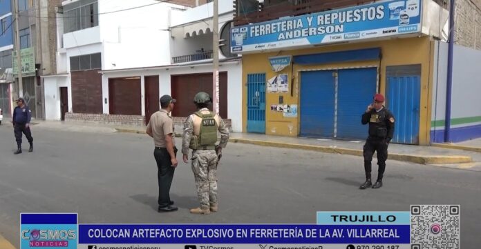 Delincuentes siguen haciendo de las suyas. Facinerosos dejaron un artefacto explosivo en un negocio ubicado en la Av. Federico Villarreal, cuadra ocho, a solo un paso de un grifo y a media cuadra del cuartel del Ejército en Trujillo. Los malhechores colocaron el material en la puerta de un inmueble, donde funciona una ferretería.