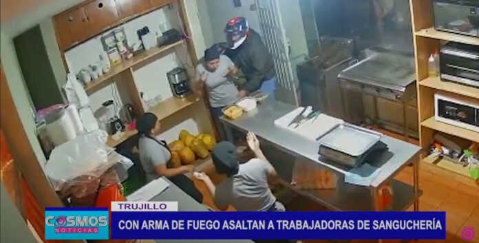 Las cámaras de seguridad de este local, registraron cuando un sujeto con arma de fuego y puesto un casco, ingresa a la cocina de esta sanguchería, donde estaban tres trabajadoras, el delincuente comienza a rebuscar entre sus pertenencias celulares y les ordena que se agachen para poder ir por la caja chica.