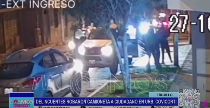 La delincuencia continúa en ascenso en la ciudad de Trujillo, esta vez el objetivo de 4 malhechores fue despojar de su camioneta a un morador de la urbanización Covicorti, cámaras de seguridad captaron los precisos instantes en que el ciudadano es bajado a la fuerza de su vehículo y posteriormente los delincuentes salen huyendo con la unidad.