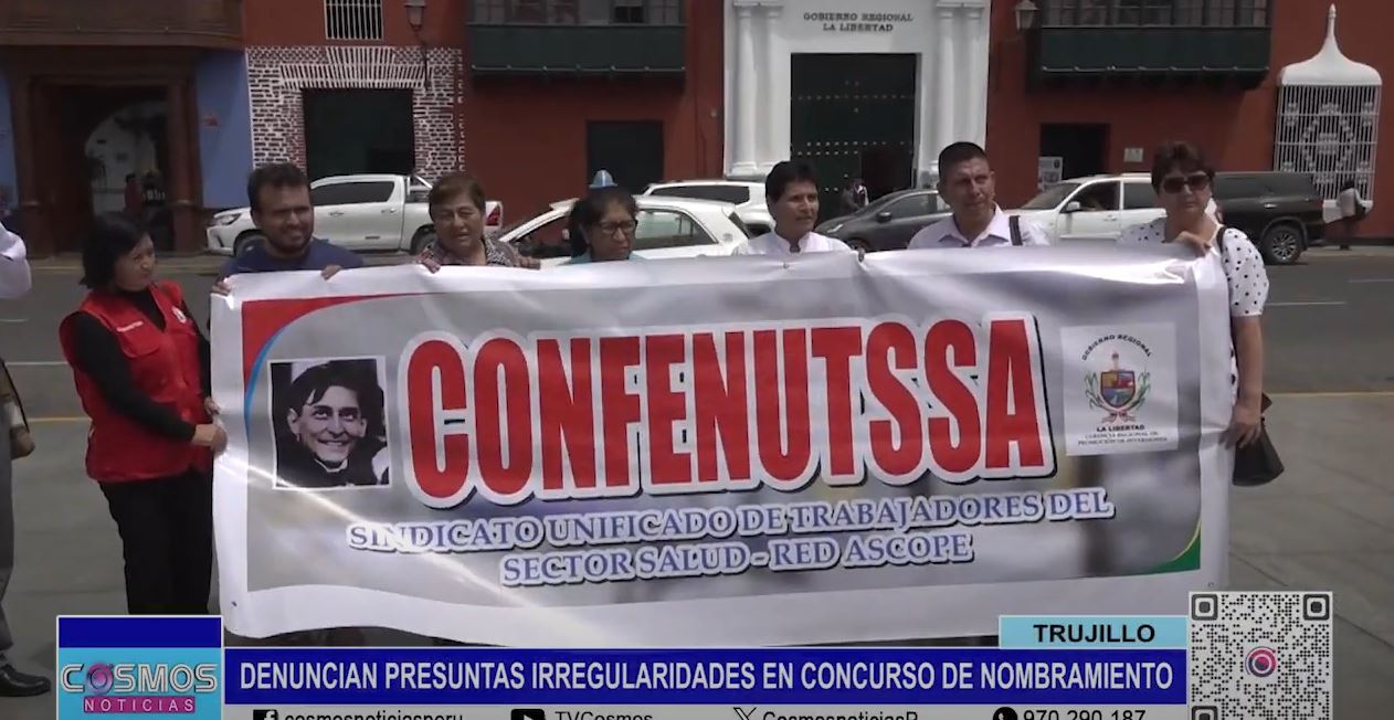 Los dirigentes de la Confederación Nacional de Trabajadores del Sector Salud de La Libertad realizaron un plantón en la Plaza Mayor de Trujillo para denunciar presuntas irregularidades en el proceso de nombramiento de personal de la Red de Salud – Ascope.