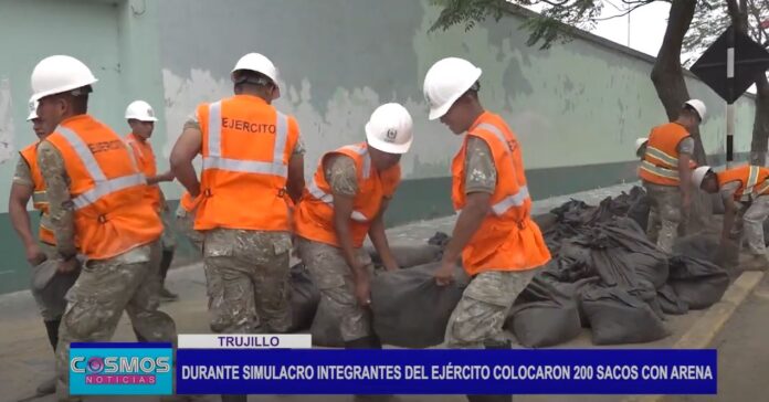 Integrantes del Ejército del Perú, participaron del simulacro “La ruta del Agua” organizado por la Municipalidad Provincial de Trujillo. La finalidad fue evaluar el tiempo que demora colocar sacos con arena en la intersección de la Av. Miraflores.