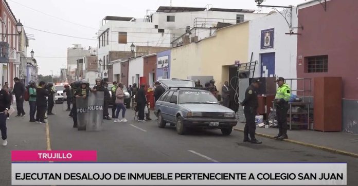 El Poder Judicial y la policía efectuaron un desalojo de la cuadra dos del jirón Francisco Pizarro, en el centro de Trujillo. La medida se realizó de forma pacífica en el predio de propiedad del colegio San Juan.
