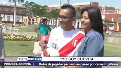 A horas del choque trascendental ante la selección brasileña, un doble de jugador Christian Cueva alborotó a los transeúntes en la Plaza Mayor de Trujillo. Llegó desbordando alegría y prometiendo una victoria ante Brasil este martes a las 8 de la noche.