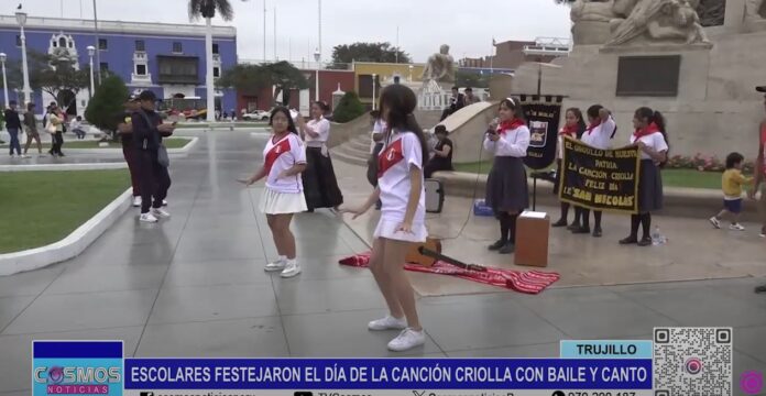 A ritmo de guitarra y cajón, los alumnos de la Institución Educativa San Nicolás celebraron el día de la canción criolla con una presentación de canto y baile en la Plaza Mayor de Trujillo.