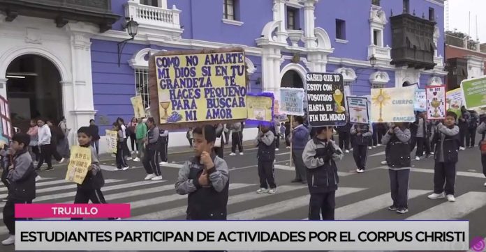 Delegaciones de cerca de 30 instituciones educativas de Trujillo participaron de una marcha por el inicio de la semana eucarística 2024. La celebración del Corpus Christi será este 30 de mayo desde las 4 de la tarde en la plaza mayor de la ciudad.